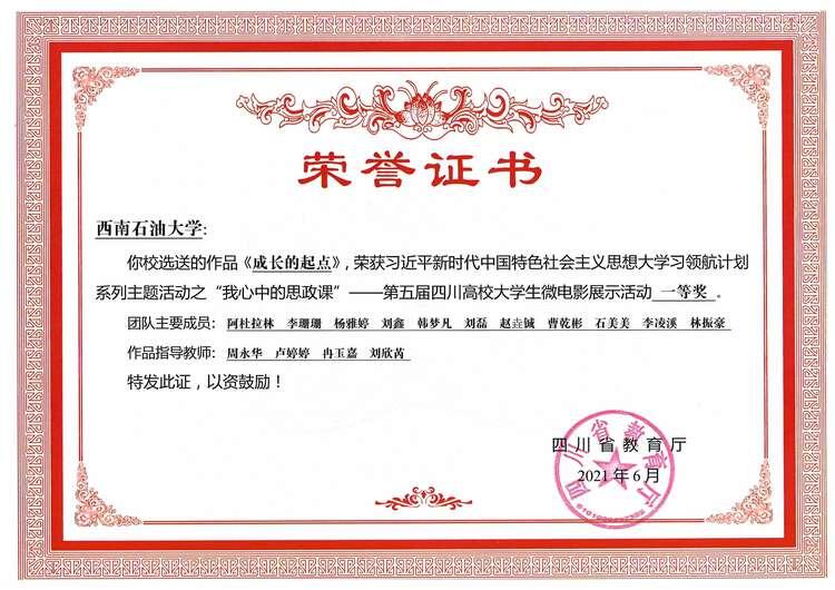 工程管理2020級阿杜拉林等同學獲得第五屆四川高校大學生微電影展示活動一等獎