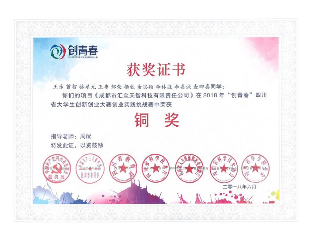 獎項名稱:2018年“創青春”四川省大學生創新創業大賽創業實踐挑戰賽銅獎