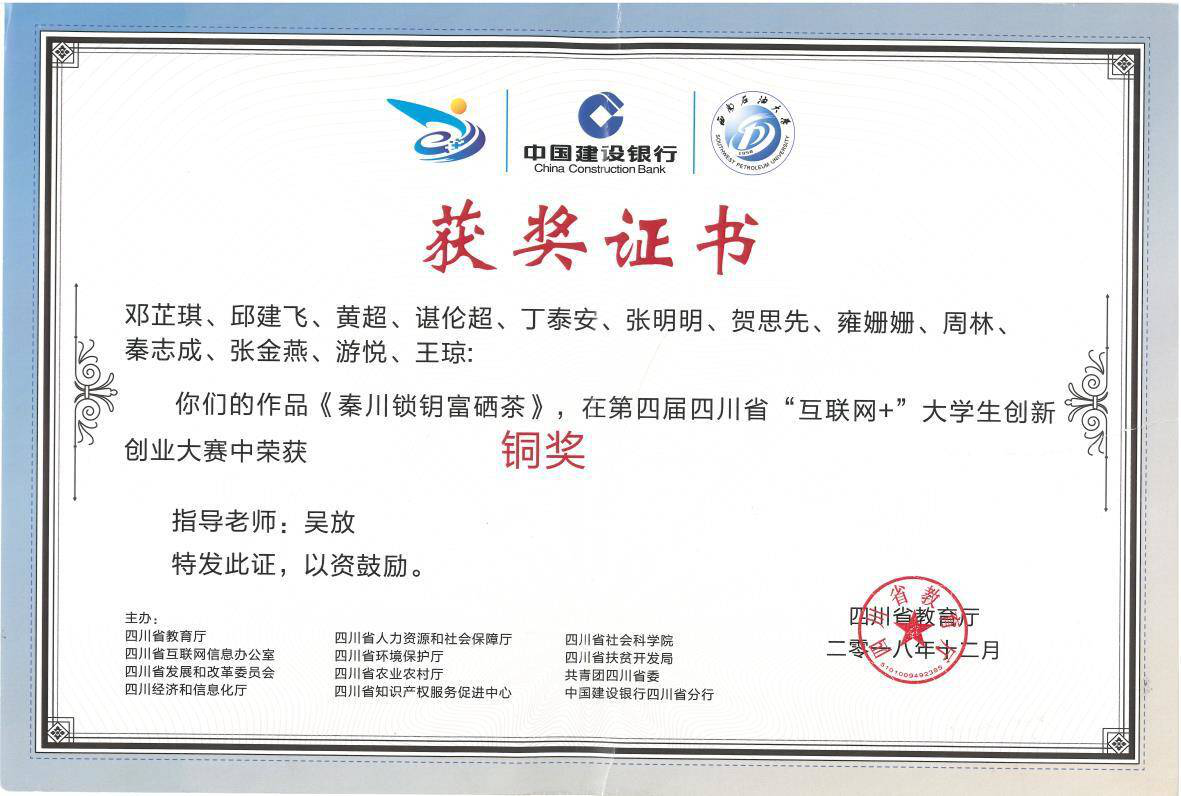 獎(jiǎng)項(xiàng)名稱:第四屆四川省“互聯(lián)網(wǎng)+”大學(xué)生創(chuàng)新創(chuàng)業(yè)大賽銅獎(jiǎng)