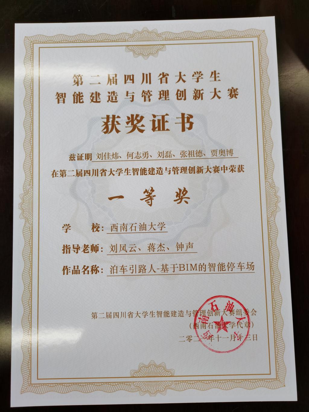 獎(jiǎng)項(xiàng)名稱:2021年第二屆四川省大學(xué)生智能建造與管理創(chuàng)新大賽一等獎(jiǎng)