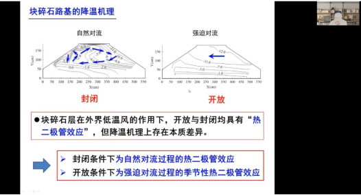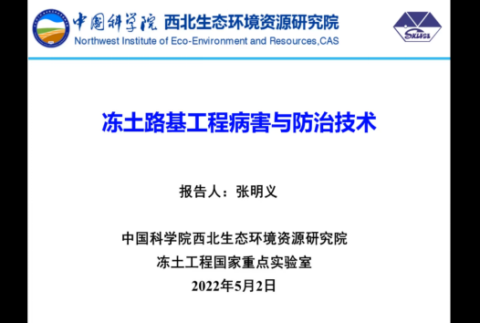 講座中,張明義研究員首先分析了多年凍土區路基工程病害類型、特征及成因,由于氣候變暖,凍土退化嚴重,多年凍土退化會引發路基工程病害,凍土工程高病害率成為了世界性難題。隨后,介紹了凍土路基熱力穩定性計算理論與模型,考慮凍融變形和體積未凍水滯后效應,確定了土體導熱系數、體積熱容兩個關鍵參數,介紹了水分遷移方程、能量方程、力學方程及相互耦合關系。之后,展示了凍土路基工程病害最新防治技術,闡述了對于不同含冰量的凍土采用的不同設計原則。最后,從理論與數值模擬、研究領域、研究區域等方面對凍土工程研究的未來發展趨勢進行了展望。