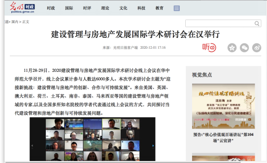 光明日?qǐng)?bào)以“建設(shè)管理與房地產(chǎn)發(fā)展國(guó)際學(xué)術(shù)研討會(huì)在漢舉行”;長(zhǎng)江日?qǐng)?bào)以“世界頂尖名校學(xué)者開啟‘云端’研討,探討管理與房地產(chǎn)可持續(xù)發(fā)展”;楚天都市報(bào)以“國(guó)內(nèi)外專家學(xué)者線上齊聚,共話當(dāng)代建設(shè)管理與房地產(chǎn)發(fā)展”為題對(duì)此學(xué)術(shù)研討會(huì)進(jìn)行了報(bào)道。