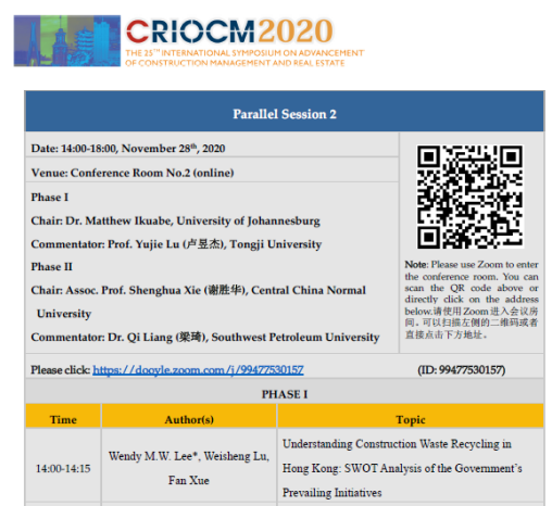 11月28日—11月29日,由中華建設(shè)管理研究會(huì)(CRIOCM)和華中師范大學(xué)主辦的“第25屆建設(shè)管理與房地產(chǎn)發(fā)展國(guó)際學(xué)術(shù)研討會(huì)”在中國(guó)武漢隆重召開,分享最新成果,碰撞思想火花,共謀未來發(fā)展。該會(huì)議迄今已成功舉辦24屆,在建設(shè)管理和房地產(chǎn)領(lǐng)域享有顯著的國(guó)際聲譽(yù),并被多所國(guó)外高校認(rèn)定為A類國(guó)際會(huì)議。由于疫情的影響,此次會(huì)議全程在網(wǎng)上召開。