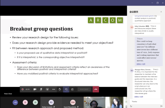 11月25日,由英國建筑管理研究人員協會(ARCOM)主辦的定性研究方法博士研討會(Doctoral workshop in qualitative research methods)在線上通過Microsoft team開展。我院梁琦博士及兩名碩士研究生向研討會提交了研究計劃書(proposal)并應邀參會。