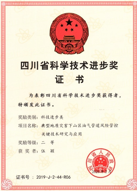 我校作為第2完成單位,我院張鵬教授(第3完成人)、伍穎副教授(第6完成人)參與完成的《典型地質災害下山區油氣管道風險管控關鍵技術研究與應用》成果獲得2019年四川省科技進步獎二等獎。