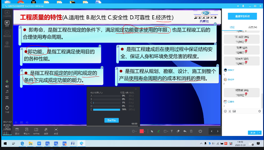 經過網絡課堂的實踐體驗以及同學們反饋的意見和建議,我采取的授課思路是:課首內容提要與復習-課中授課即問即答-課后完成課程中心任務點的學習與作業。其中我認為最有特點也深受同學們喜愛的環節就是課中穿插的即問即答環節,通過答題卡計時問答、舉手功能音頻作答,以及討論區隨時提問的方式,那種互動的效果,一點不亞于教室里的現場氣氛。