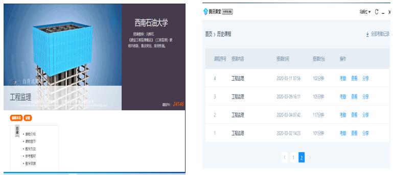 看到《工程監理》課程的學習通網站從無到有,到如今已有近2.5萬的學習量,以及騰訊課堂對每一次課上情況與課后回放人次的記錄,還有學校課程中心醒目的內容展示,我的感覺是累并幸福著。