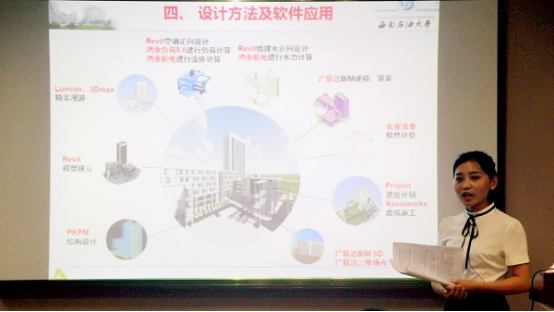 隨后,工程管理專業2014級學生趙敏、譚汶沁作為學生代表為現場嘉賓綜合介紹了本次西南石油大學本科實驗樓A區工程聯合畢業設計的整體情況,對整個項目中的詳細分工,以及信息流程,協作交互的情況進行了具體介紹,并通過一個視頻展示了工作成果,精美直觀的三維模型動態漫游展示贏得了現場嘉賓和答辯組的掌聲肯定。本次聯合畢業設計共使用了13種新型的建筑信息化軟件,涉及土木工程、建筑環境與能源應用工程和工程管理三個專業12名學生,包含結構設計、暖通空調設計、給排水工程設計、施工組織設計和工程計量計價五個工作模塊。介紹中還總結了所遇到的問題,包括硬件條件不足,未能完成碰撞檢測,給排水工程設計完成時間太晚而未能給結構設計進行預留孔洞設計流出足夠的時間。