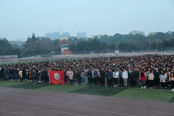 天色微亮,升旗儀式正式開始。國旗護衛隊在全體師生的注視下,護旗前行。隨著國歌奏響,護衛隊成員升起國旗,全體師生行注目禮。