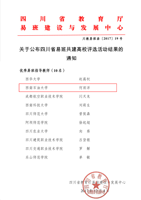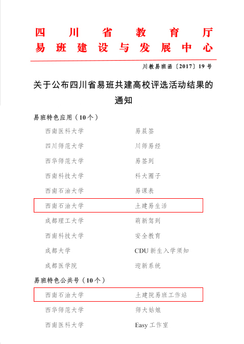 近日,四川省教育廳易班建設與發展中心公布了2017年度四川省易班共建高校評選結果。在我院師生的共同努力下,經各共建高校推薦、易班投票和專家評審,報四川省教育廳審議通過,我院在三個項目評選中榮獲全省十佳。其中,土建易生活榮獲“易班特色十佳應用”,土建院易班工作站榮獲“易班特色十佳公眾號”,何雨洋老師榮獲“優秀易班十佳指導教師”。