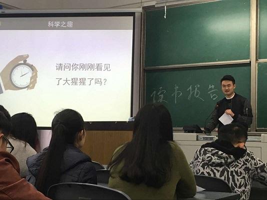 在本次交流會(huì)中,同學(xué)們表現(xiàn)出了濃厚的熱情和興趣,其中以付郁桐、陳源和皮杰為代表上臺(tái)發(fā)表了自己的心得體會(huì)。臺(tái)上同學(xué)們激情澎湃地演講,臺(tái)下同學(xué)們認(rèn)認(rèn)真真地聆聽,并在演講中穿插了游戲環(huán)節(jié)、視頻歌曲分享環(huán)節(jié)等等,表現(xiàn)出了同學(xué)們的青春活力和對(duì)生活的熱愛以及對(duì)科學(xué)精神的崇高敬仰,其中,以“請問你看到大猩猩了嗎”這個(gè)游戲,使現(xiàn)場氣氛達(dá)到了高潮。