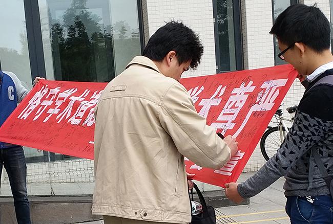 通過這次簽名活動,同學們進一步了解了學校對學風建設的決心,深刻認識到恪守學術道德對我們研究生的至關重要性?;顒咏Y束后工作人員把簽滿名字的橫幅掛在明志樓A區大廳,讓它時時提醒我們每一個土建人,恪守學術道德,你我有責!(土建院研究生會組織宣傳部 陳原 )