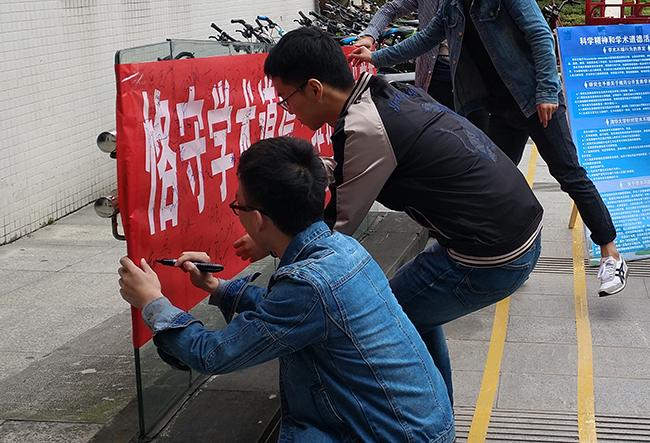 “恪守學術道德,維護學術尊嚴”的紅色條幅和活動宣傳展板,吸引了眾多同學的目光,紛紛在條幅上簽名,表明自己履行承諾的決心。在活動過程中,工作人員積極宣傳的本次活動的精神以及一些高校對于學術道德問題的處罰辦法,在廣大同學中間營造出了“腳踏實地,實事求是”的良好學術氛圍。