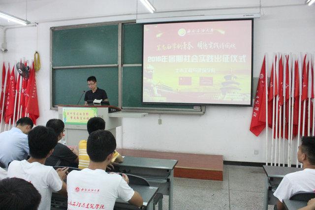 出征儀式在同學們的國歌聲中揭幕,隨后周永華老師介紹了今年暑期社會實踐活動的概況。本次暑期社會實踐,土建院共申報各級實踐團隊59支,其中向校團委推薦校級團隊10支,49支為院級團隊,參與同學共728人,指導教師6人,涵蓋我院5個專業三個年級。暑假期間實踐隊員將前往北京、天津、四川、西藏、寧夏、青海、江西、廣東、貴州、陜西等14個省份,走進農村、走向城鎮、走入生產一線,緊緊圍繞踐行社會主義核心價值觀、“創新創業”專項調研、環保微視角、基礎教育調研、志愿中國夢、建筑行業人才需求狀況調研、紅色基地愛國主義教育、緬懷革命先烈、關愛老人兒童等內容開展形式多樣、喜聞樂見的各種社會實踐活動。