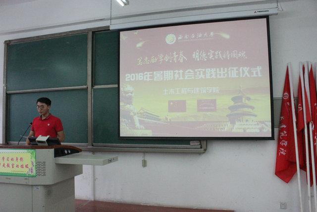 暑期臨近,七月驕陽似火,土木工程與建筑學院的各支實踐隊伍正緊張而有序地為今年的暑期社會實踐做著準備工作。6月30日下午,“土木工程與建筑學院2016年暑期社會實踐出征儀式”在明志樓A308隆重舉行,本次社會實踐以“篤志勵學創青春,明德實踐鑄國魂”為主題,學院黨委副書記姚遠、團委書記周永華、團委副書記王睿喆、2015級輔導員陳鵬磊、吳放等出席,出征儀式由輔導員周配老師主持。