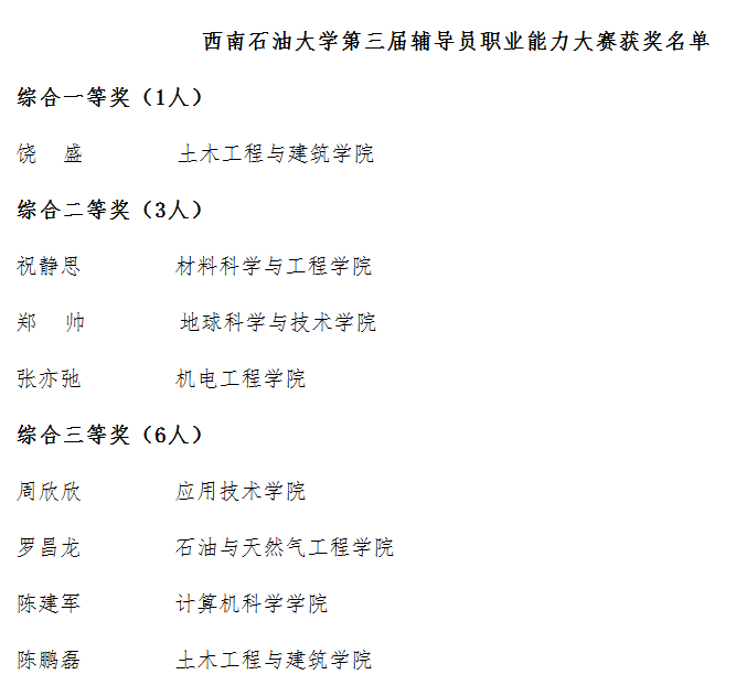 公示鏈接:《關(guān)于公布西南石油大學(xué)第三屆輔導(dǎo)員職業(yè)能力大賽結(jié)果的通知》