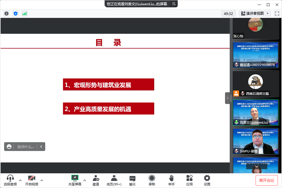 西南石油大學(xué)第五屆工程管理論壇隨后進(jìn)行,論壇由學(xué)院副院長(zhǎng)梁琦老師主持。重慶大學(xué)黨委常委、副校長(zhǎng)劉貴文出席論壇、作題為“‘十四五’期間建筑業(yè)高質(zhì)量發(fā)展趨勢(shì)和機(jī)遇”的學(xué)術(shù)報(bào)告,用詳實(shí)的數(shù)據(jù)全面地介紹了“十四五”期間建筑業(yè)所處的階段、發(fā)展的趨勢(shì)、行業(yè)存在的問(wèn)題以及潛在的機(jī)遇。我校教授蘇昊、東南大學(xué)副教授蘇舒、優(yōu)秀畢業(yè)生王文飛分別作了精彩的學(xué)術(shù)分享。論壇最后,劉紅勇教授介紹了我校工程管理碩士MEM培養(yǎng)計(jì)劃,并作論壇總結(jié)。