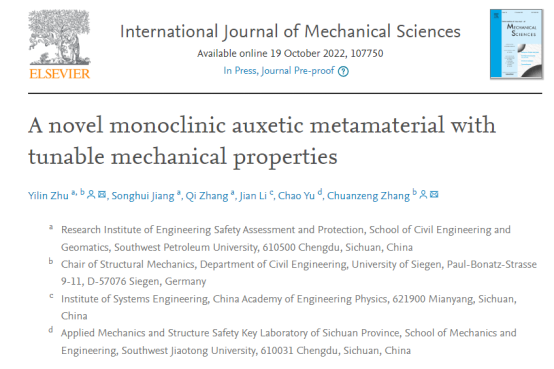 近期,我院朱一林副研究員團(tuán)隊(duì)(朱一林副研究員為第一及通訊作者;歐洲科學(xué)院院士、德國(guó)錫根大學(xué)結(jié)構(gòu)力學(xué)系張傳增教授為論文共同通訊作者)在中科院一區(qū)TOP期刊《International Journal of Mechanical Sciences》(IF=6.772)上發(fā)表了題為“A novel monoclinic auxetic metamaterial with tunable mechanical properties”的論文。