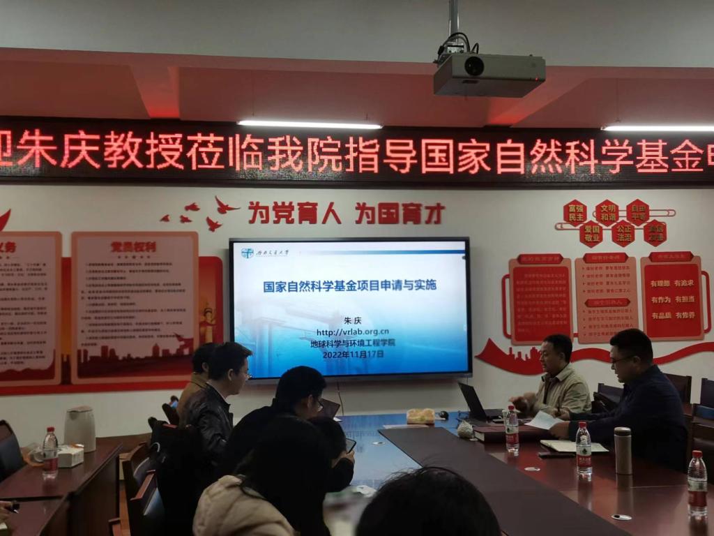 11月17日下午,西南交通大學(xué)地球科學(xué)與環(huán)境工程學(xué)院教授、國(guó)家長(zhǎng)江學(xué)者朱慶教授受邀來我院分享了國(guó)家自然基金寫作與申報(bào)經(jīng)驗(yàn),本次交流會(huì)采用線上及線下會(huì)議同步的形式開展。會(huì)議由胡啟軍副院長(zhǎng)主持,熊俊楠副院長(zhǎng)、肖東升教授等我院20余名教師線下參加了會(huì)議。