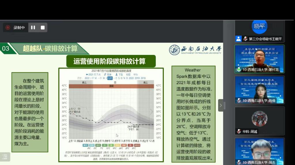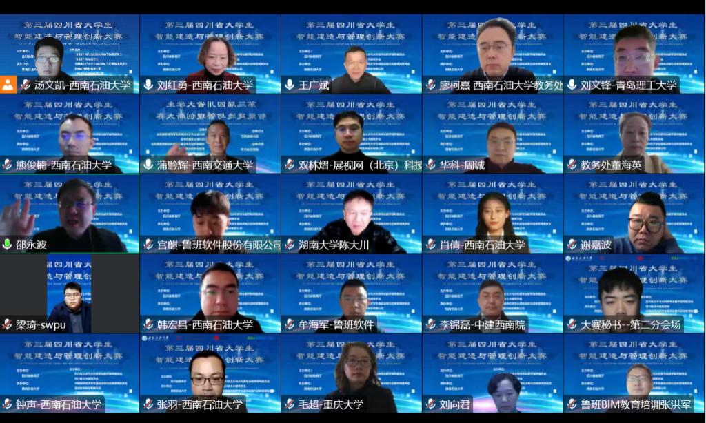 四川省大學(xué)生智能建造與管理創(chuàng)新大賽由四川省教育廳主辦、西南石油大學(xué)承辦、土木工程與測繪學(xué)院組織執(zhí)行。來自省內(nèi)外的46支隊伍參加復(fù)賽,經(jīng)32位復(fù)賽評審專家評審后,最終共有28支隊伍進(jìn)入決賽。本次比賽歷時6個月,設(shè)一等獎6名、二等獎9名、三等獎13名。因受疫情影響,決賽全程采用線上方式進(jìn)行,使用騰訊會議進(jìn)行作品展示和答辯,通過嗶哩嗶哩進(jìn)行開幕式閉幕式直播。