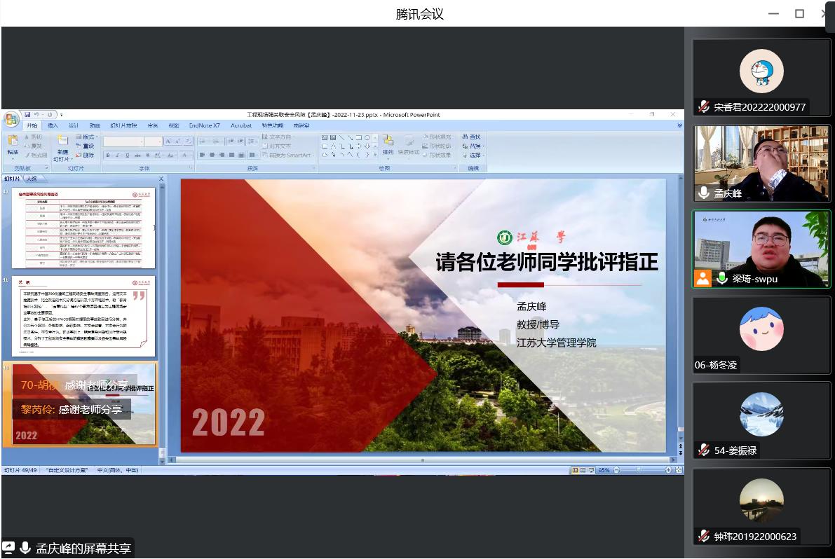 11月23日下午,我院邀請江蘇大學(xué)孟慶峰教授為師生作“工程現(xiàn)場安全風(fēng)險的強關(guān)聯(lián)機理與致因路徑研究”專題學(xué)術(shù)講座。孟慶峰教授是南京大學(xué)管理科學(xué)與工程博士,江蘇大學(xué)管理科學(xué)與工程博士后,澳大利亞科廷大學(xué)訪問學(xué)者,現(xiàn)為江蘇大學(xué)教授、博士生導(dǎo)師;江蘇省“社科優(yōu)青”。本次講座由副院長梁琦主持。