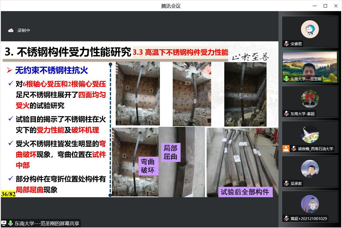 在講座中,范圣剛教授首先向師生介紹了不銹鋼結構的應用與發展,明確了工程中不銹鋼材料與構件抗火性能研究的重要性。其次,闡述了不銹鋼材料的力學性能,揭示了其構件在火災下的行為反應與破壞機理。然后,通過試驗方法和數值分析,研究了不銹鋼材料力學性能隨溫度變化規律,構建了高溫下不銹鋼材料精細化力學性能統一模型,給出了不銹鋼結構的設計建議。最后,總結了不銹鋼結構的計算理論與抗火性能相關研究成果。