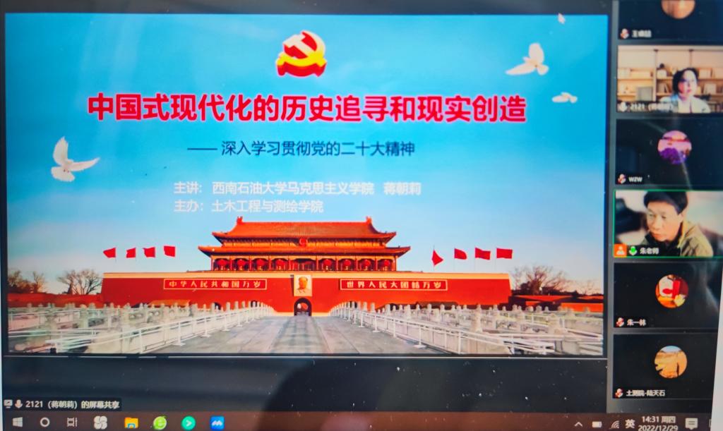 12月29日下午,土木工程與測繪學院黨委邀請學校黨的二十大精神宣講團成員、馬克思主義學院蔣朝莉教授做黨的二十大精神宣講報告。宣講報告會采用騰訊會議線上直播的形式進行,土測院黨委書記朱松柏主持會議,學院全體教職工參加了會議。