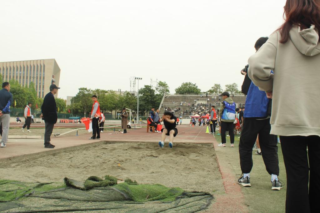 在田徑場的另一方,田賽也在如火如荼地進(jìn)行著。在跳高比賽場地,土測院學(xué)子起跑加速,如燕般輕盈越過橫桿,再從軟墊上彈起,滿臉春風(fēng);另一邊,土測院的跳遠(yuǎn)選手也在為榮譽(yù)而戰(zhàn)。看他們在跑道上如獵豹般向前沖去,縱身一躍,塵土飛揚(yáng)間,掌聲雷動,高下立見,他們用實(shí)力證明了自我。鉛球這邊也是同樣精彩,力拔山兮氣蓋世,欲與天公試比高,只見選手們背身,彎腰,發(fā)力,拋出,一系列動作一氣呵成,在空中劃過一條優(yōu)美的弧線,頓時歡呼聲溢滿了整個賽場。