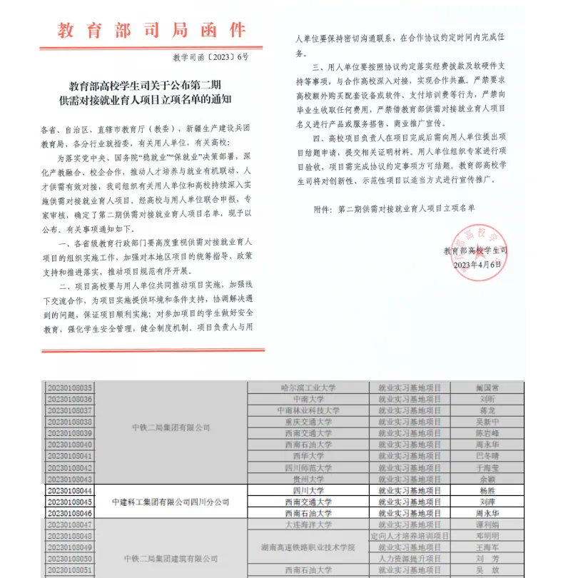 2023年4月6日,教育部公布第二期供需對接就業育人項目立項名單,四川公司和西南石油大學共同申報的大學生就業實習基地項目成功立項,這是深入貫徹落實黨中央、國務院“穩就業、保就業”決策部署,進一步深化產教融合、校企合作,實現人才培養與就業有機聯動、人才供需有效對接的重要舉措。