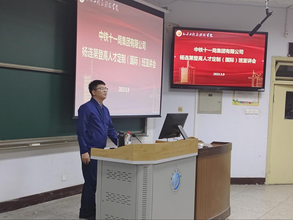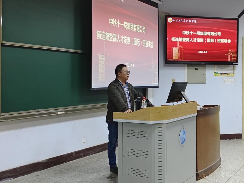 王宜濤介紹了中鐵十一局集團公司歷史沿革、近年來改革發展、科研創新等情況,重點介紹了“楊連弟登高人才定制(國際)班”建立的目的、意義及培養規劃相關內容和公司未來發展規劃、人才隊伍建設思路、校企合作等情況,并詳細介紹了當前職業技術崗位的現狀及未來發展趨勢。他表示,中鐵十一局高度重視企校合作,與國內多所知名高校建立了合作關系。希望進一步密切與學院的合作交流,努力讓企校合作結出豐碩成果。也希望同學們積極報名定制班,在學習中長才干、見世面。
