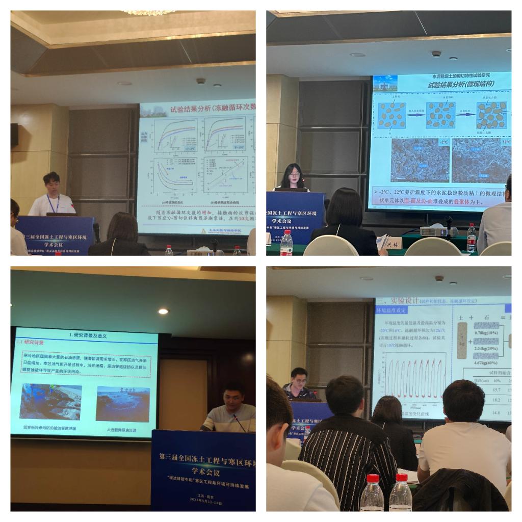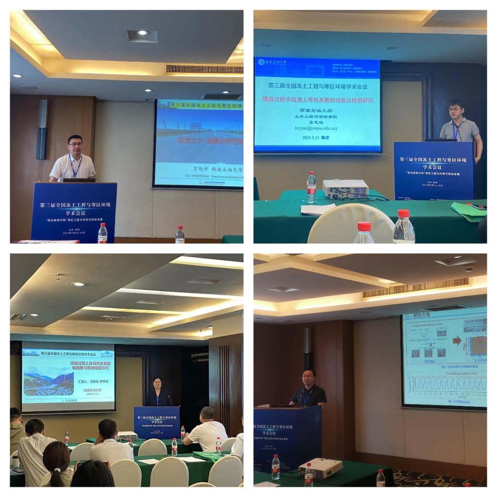 2023年第三屆全國凍土工程與寒區環境學術會議于5月12日至14日在南京隆重召開。我院寒區工程與多孔介質材料團隊參加了會議并作系列報告。萬旭升教授、路建國副研究員、晏忠瑞副教授、劉鳳云老師以及碩士研究生黃健、周浩、王寅棟和譚俐伶分別作了題為“鹽漬土水-鹽耦合特性研究”、“寒區土-石混合體水-熱-變形相互作用及熱阻尼特性研究”、“降溫過程中鹽漬土導熱系數的試驗及模型研究”、“凍結過程土體導熱系數影響因素與預測模型研究”、“凍融循環作用下石油污染黏土抗剪強度特性研究”、“鹽漬凍土-混凝土接觸面剪切特性試驗研究”、“凍融循環作用下土石混合體水熱特性及位移變化研究”和“負溫養護下水泥穩定粉質粘土的剪切特性試驗研究”的學術報告。此外,萬旭升教授和路建國副研究員分別主持了分會場論壇和研究生論壇,周浩同學獲得優秀研究生報告獎。本次會議為我院師生在凍土工程領域的科學研究提供了創新思路,開闊了學術視野,對我院學術成果宣傳和學科建設起到了積極作用。