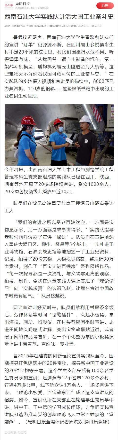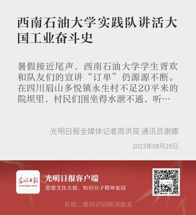 暑假接近尾聲,西南石油大學土木工程與測繪學院學生胥歡和隊友們的宣講“訂單”仍源源不斷。在四川省眉山市多悅鎮永生村不足20平米的院壩里,村民們圍坐得水泄不通,聽得津津有味。“從我國第一輛自主制造的汽車、第一架戰斗機模型、盾構機到縉云山隧道金海大橋等,這些寶物無不訴說著我國可歌可泣的工業奮斗史。”在實踐隊的實地探訪視頻和宣講員的描繪中,8000匹馬力蒸汽機、110歲的鋼軌……這些報紙書籍中出現的工業名詞生動呈現。