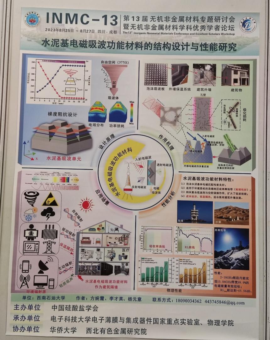 2023年8月25日至27日,第13屆無機非金屬材料專題研討會暨無機非金屬材料學科優秀學者論壇于成都新希望高新皇冠假日酒店成功舉辦。我院先進土木工程材料團隊楊元意副教授、楊婷婷老師以及碩士研究生方婉霞、李才英、宋力和石顯蕓參加了此次會議。其中,楊元意老師在先進土木工程材料分會進行了題為“水泥基電磁吸波功能材料的結構設計與性能研究”的學術報告,介紹了該團隊在水泥基電磁吸波材料方向的研究成果,吸引了該會場專家學者的高度關注,為新型土木工程功能材料的研發提供了新路徑;同時,研究生參加了相關學術海報的制作與展示。
