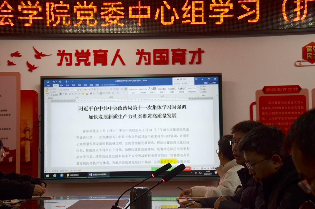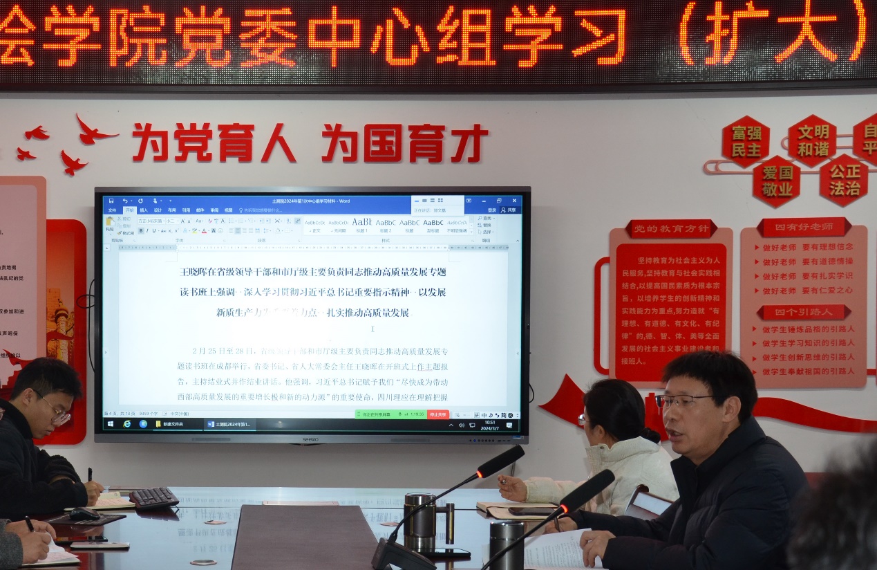 會上,朱松柏領學了習近平總書記在中共中央政治局第十一次集體學習時關于加快發展新質生產力 扎實推進高質量發展的重要論述、四川省委書記王曉輝在省級領導干部和市廳級主要負責同志推動高質量發展專題讀書班上關于深入學習貫徹習近平總書記重要指示精神以發展新質生產力為重要著力點扎實推動高質量發展的報告、《黨史教育工作條例》,傳達了學校工作部署會精神和工作要求。朱松柏指出,學校黨委決定把今年確定為“大抓落實年”,要求學院全體黨員干部、各部門要牢牢把握工作總體要求,制定切實有效舉措,狠抓貫徹落實,真正以各個點、各條線的突破,實現學院內涵式高質量發展。甘院長簡要回顧了學院2023年的工作和取得的成績,從績效考核、壓實責任、挖掘潛力等方面,闡明了今后工作思路,對2024年學院工作作了部署。