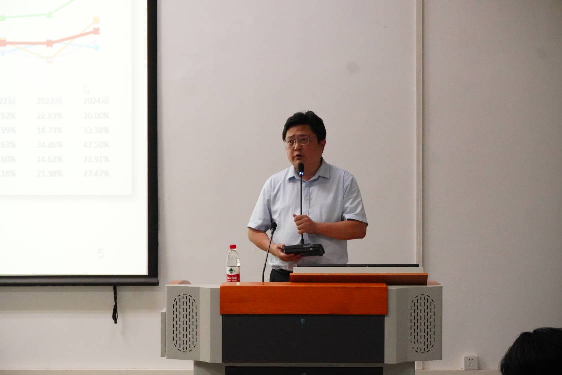 胡啟軍副院長向同學們介紹了學院發展歷程、歷年考研報考情況、應屆畢業生上岸情況及碩士研究生招生情況等相關信息,讓同學們對考研有了更清晰、全面的認識。他強調,考研對于個人成長和發展具有重要意義,并勉勵同學們結合自身情況和考研現狀,在就業與考研之間做出適合自己的選擇。在互動環節中,胡啟軍副院長認真聽取了同學們的發言,詳細解答了同學們的提問,并針對考研院校選擇和報考專業給出了建議和指導,讓同學們對考研有了更清晰的認識和規劃。