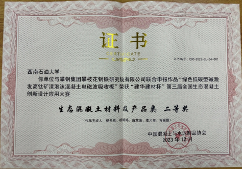 會展期間,CCPA舉辦了“建華建材杯”第三屆全國生態(tài)混凝土創(chuàng)新設(shè)計應(yīng)用大賽的頒獎儀式,并對大賽獲獎作品進行了展映。大賽以“材料低碳化、綠色結(jié)構(gòu)化”為主題,遵循公開、公正、公平的原則,以王浩院士為組長的評委會按照生態(tài)環(huán)保性能、材料與結(jié)構(gòu)性能、創(chuàng)意設(shè)計、工藝技術(shù)及施工、市場應(yīng)用和推廣等評價指標(biāo),最終評選出55項優(yōu)秀獲獎作品。我院報送作品“綠色低碳型堿激發(fā)高鈦礦渣泡沫混凝土電磁波吸收板”獲得二等獎的佳績。該作品基于綠色建筑及環(huán)保可持續(xù)發(fā)展理念,以混凝土的多功能性、環(huán)保性、高值性為混凝土生態(tài)化的研究方向,并具有重要的技術(shù)創(chuàng)新和實踐創(chuàng)新,得到了眾多評委專家的高度認(rèn)可。
