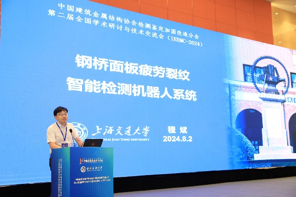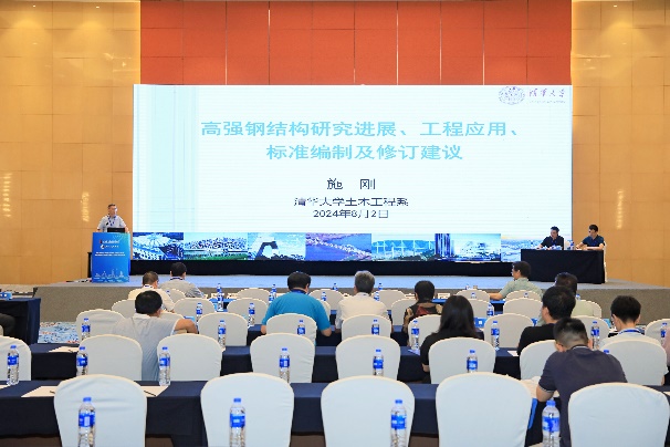 在8月2日下午的大會報告第一階段,施剛教授,劉宜豐教授級高工,鐘國輝教授,程斌教授和王偉教授分別作“高強鋼結構研究進展、工程應用、標準編制及修訂建議”、“新型大跨鋼網(wǎng)格混凝土組合殼體結構研究進展”、“高強度690兆帕鋼材鋼構的設計及工程應用”、“鋼橋面板疲勞裂紋智能檢測機器人系統(tǒng)”和“基于鋼結構關鍵構件震后損傷檢測的建筑韌性快速評估方法與應用”的大會報告。