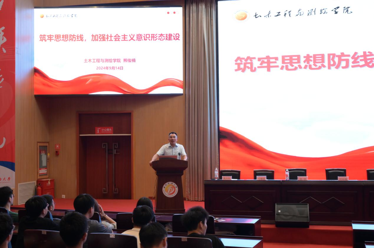 會議最后,學院黨委書記熊俊楠教授以《筑牢思想防線,加強社會主義意識形態建設》為題,為新生們上了開學第一課。熊書記重點強調了筑牢思想防線的重要性,指出青年學生應樹立正確的世界觀、人生觀、價值觀,加強意識形態的建設;鼓勵學生克服敵對勢力的干擾,堅持社會主義,積極維護國家網絡安全和政治安全。同時,熊書記闡述了建筑行業發展現狀及轉型升級方向,勸勉學生全面發展,做有理想、有本領、有擔當的新時代青年,為實現中華民族偉大復興的中國夢貢獻青春力量,為新生大學生活指明了方向。