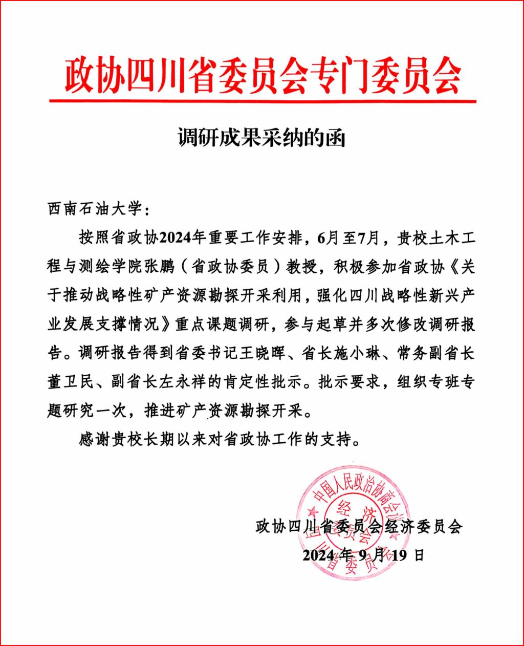 近日,我校四川無(wú)黨派人士張鵬工作室負(fù)責(zé)人張鵬,積極參加省政協(xié)《關(guān)于推動(dòng)戰(zhàn)略性礦產(chǎn)資源勘探開(kāi)采利用,強(qiáng)化四川戰(zhàn)略性新興產(chǎn)業(yè)發(fā)展支撐情況》重點(diǎn)課題調(diào)研,參與起草此項(xiàng)調(diào)研報(bào)告。報(bào)告得到省委書記王曉暉、省長(zhǎng)施小琳、常務(wù)副省長(zhǎng)董衛(wèi)民、分管副省長(zhǎng)左永祥的肯定性批示,批示要求“組織專班開(kāi)展研究,推進(jìn)礦產(chǎn)資源勘探開(kāi)采工作”。為此,四川省政協(xié)為學(xué)校發(fā)來(lái)了“調(diào)研成果采納的函”,表示“感謝貴校長(zhǎng)期以來(lái)對(duì)省政協(xié)工作的支持”。