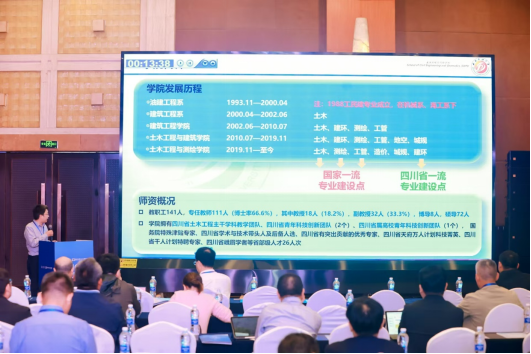 學院甘丹教授、教授委員會主任樊曉一教授、學科負責人蒲萬麗教授參加了此次盛會。甘丹院長在專業建設會場做“西南石油大學土木工程專業創新人才培養與課程思政建設探索與實踐”的報告。報告從學院發展歷程、師資概況、專業和學科概況、專業定位及人才培養模式、學位點等方面介紹了學院概況,并重點從“課程思政”示范專業建設、黨建引領和社會實踐、“課程思政”示范課程建設、“課程思政”示范教學團隊建設、聯合畢業設計、土木工程創新實踐等方面的教學改革,向全國高校土木工程學院(系)院長(主任)介紹了學院取得的成就。