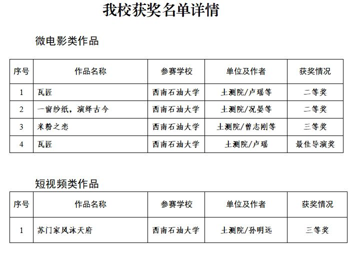 近日,四川省第二屆中華優(yōu)秀傳統(tǒng)文化視聽作品推選展播活動獲獎名單公布,我校共計5件作品獲獎,均為我院師生作品。其中《瓦匠》、《一窗紗紙,演繹古今》在大賽中斬獲二等獎,《蘇門家風(fēng)沐天府》《米粉之戀》獲三等獎,土測院輔導(dǎo)員盧瑤獲評最佳導(dǎo)演獎,獲獎總數(shù)在全省高校中名列前茅。
