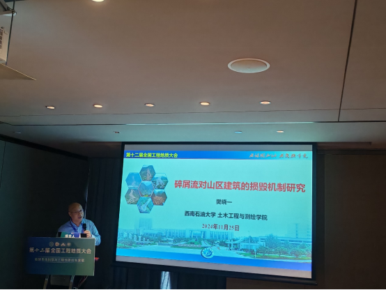 秋意融融,相聚鵬城,第十二屆全國工程地質大會于2024年11月22日至26日在深圳隆重召開。我院樊曉一教授和博士生夏貴平參加了本次大會,樊曉一教授以“碎屑流對山區建筑的損毀機制研究”為題作學術報告,系統闡述了災難性高位滑坡致災特征、典型災難性高位滑坡致災參數、巖土體顆粒對致災參數的作用、災難性高位滑坡對山區建筑損毀模式方面取得的研究成果。
