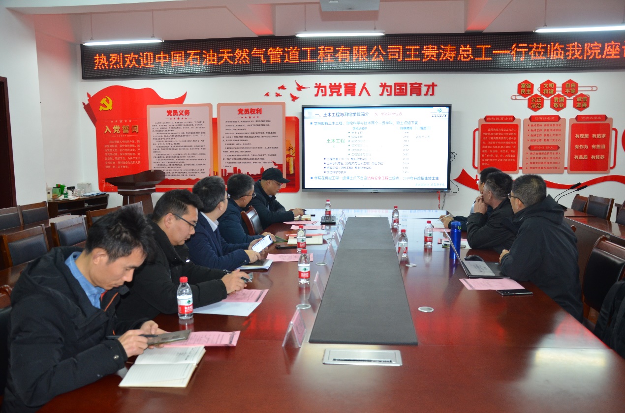 會上,熊俊楠、甘丹、樊曉一對王總等管道公司領導來訪表示熱烈歡迎,并簡要介紹了學校和學院歷史沿革、人才培養及科技創新等情況,重點介紹了學院在油氣管網管道領域開展的科研工作和取得的成果。感謝管道公司多年來對學校和學院發展的支持與幫助,希望雙方進一步加強交流合作。