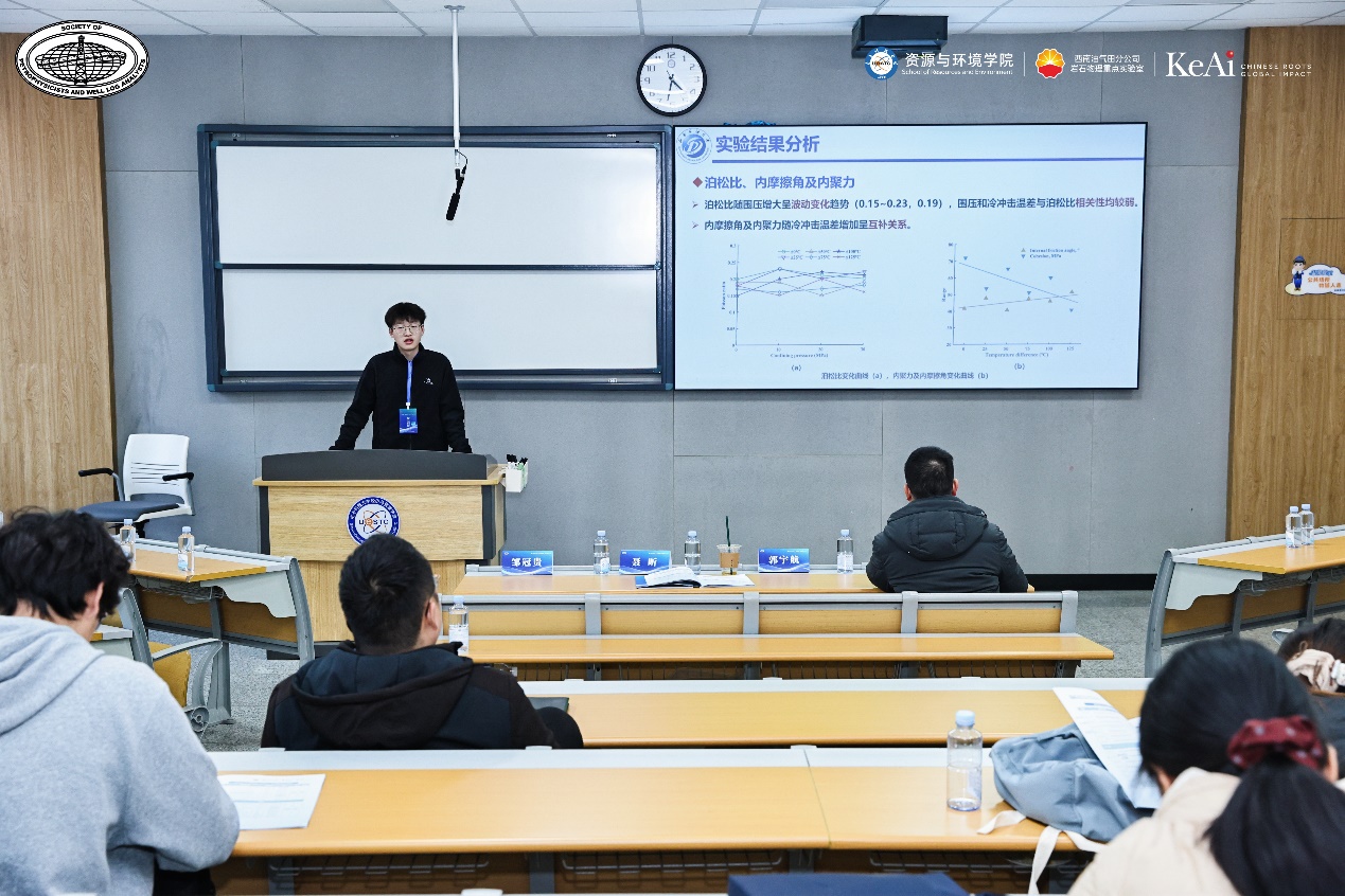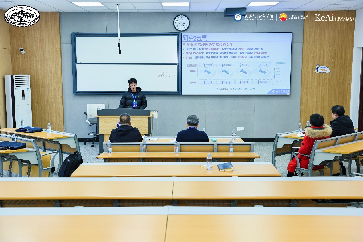 鄧煉剛在報(bào)告 “深層頁巖暫堵壓裂控制機(jī)理研究” 中,深入剖析了深層頁巖的地質(zhì)特征,開展數(shù)值模擬分析暫堵壓裂技術(shù)在深層頁巖開采中的應(yīng)用原理與控制機(jī)理。朱勝榮的 “超低粘度壓裂裂縫非均衡擴(kuò)展數(shù)值模擬” 報(bào)告,借助數(shù)值模擬技術(shù),展示了不同地質(zhì)條件、壓裂參數(shù)下裂縫擴(kuò)展的動(dòng)態(tài)過程。劉睿在 “冷沖擊溫差對深層頁巖力學(xué)特征影響試驗(yàn)研究” 中,通過一系列試驗(yàn),揭示了冷沖擊溫差對深層頁巖力學(xué)特征的影響規(guī)律。裴苓君的 “剪切流條件下含支撐劑裂縫的剪切和摩擦特性” 報(bào)告,深入研究了剪切流條件下含支撐劑裂縫的力學(xué)行為。其中鄧煉剛、劉睿兩位同學(xué)在此次匯報(bào)中獲優(yōu)秀報(bào)告。他們的研究成果不僅展示了我院在相關(guān)領(lǐng)域的科研實(shí)力,也為推動(dòng)地球物理勘探和工程等領(lǐng)域的發(fā)展提供了新的思路和方法。