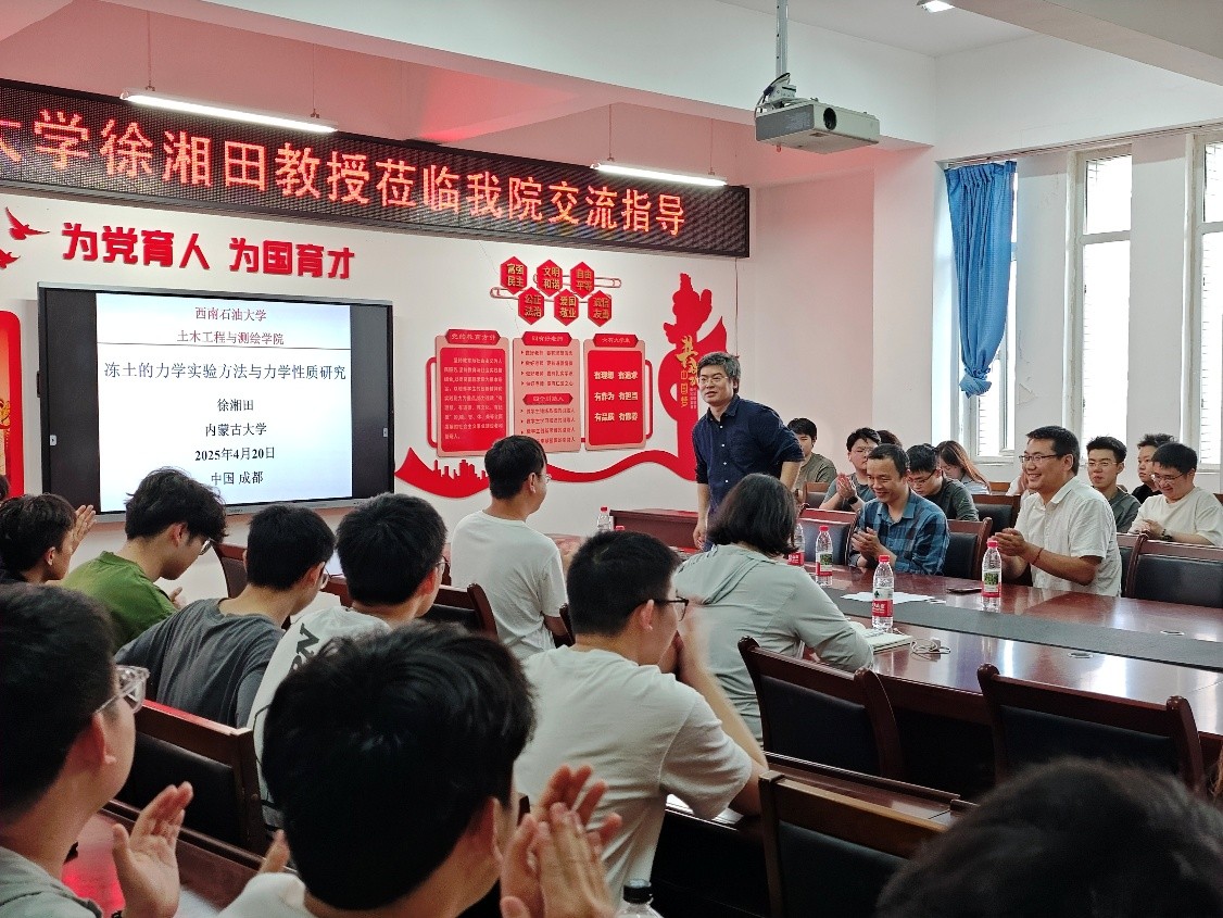 4月20日下午,內蒙古大學徐湘田教授應邀來到我院,在明志樓A536為師生們帶來了一場題為“凍土的力學實驗方法與力學性質研究”的學術報告。本次報告由我院副院長萬旭升教授主持,吸引了眾多研究生和青年教師的參與。