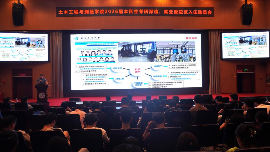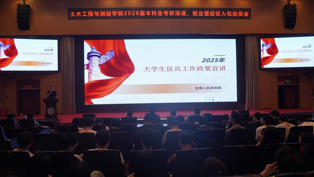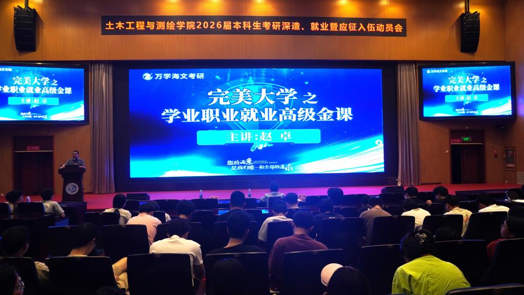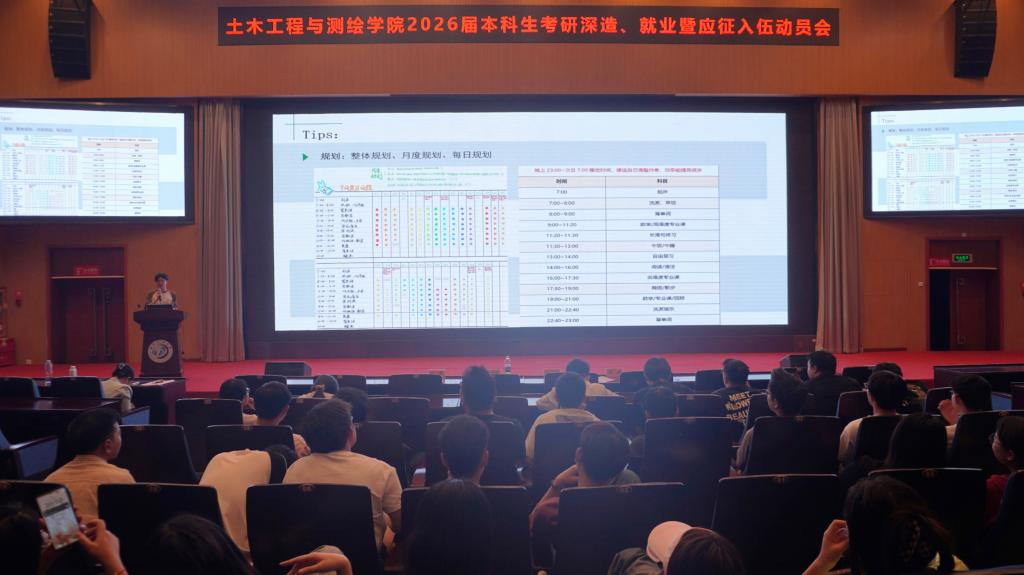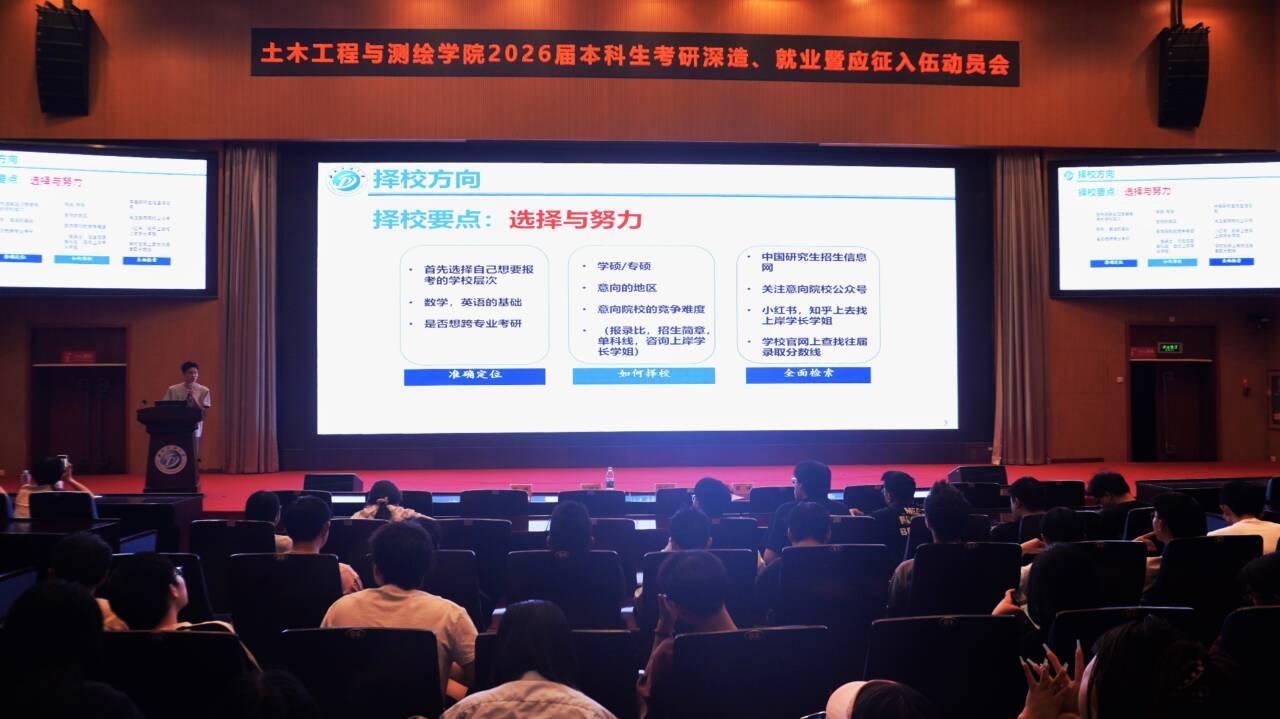 為提前謀劃、提早部署學院2026屆本科生就業工作,充分調動同學們就業考研積極性,幫助學生全面了解就業與考研形勢,4月28日晚,土木工程與測繪學院在圖書館學術報告廳召開2026屆本科生考研深造、就業暨應征入伍動員大會,學院黨委副書記何雨洋、學院副院長潘海澤、學院副院長萬旭升、學院副院長梁琦及2022級輔導員參加會議,萬學教育趙卓以及2025屆學長代表作專題分享。