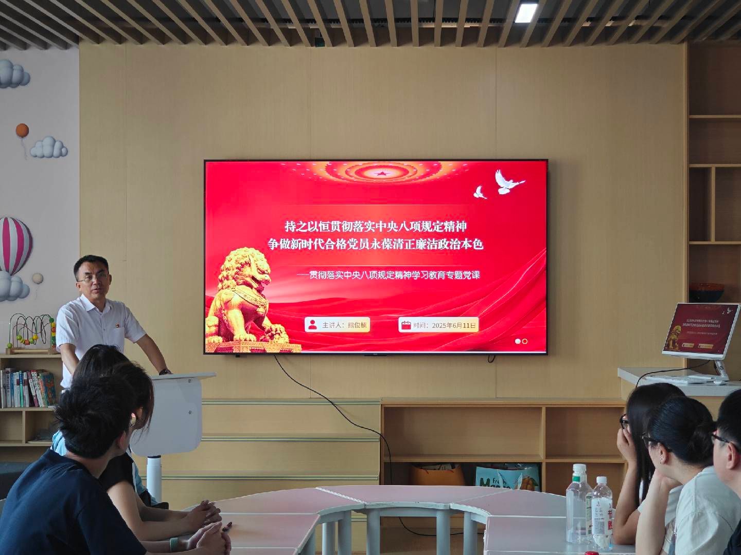 黨委書記熊俊楠以《持之以恒貫徹落實中央八項規定精神,爭做新時代合格黨員,永葆清正廉潔政治本色》為主題,為與會黨員開展紀律黨課。 熊俊楠系統梳理中央八項規定精神的發展脈絡與實踐要求,黨課聚焦以案為鑒,警示教育直擊廉潔風險點。他勉勵黨員實踐礪行,對標新時代合格黨員標準,以開展學習教育為契機,踏石留印、抓鐵有痕抓好作風建設。同時在畢業季,廣大黨員同志要緊繃紀律之弦、筑牢思想防線,用清風正氣為畢業季護航。