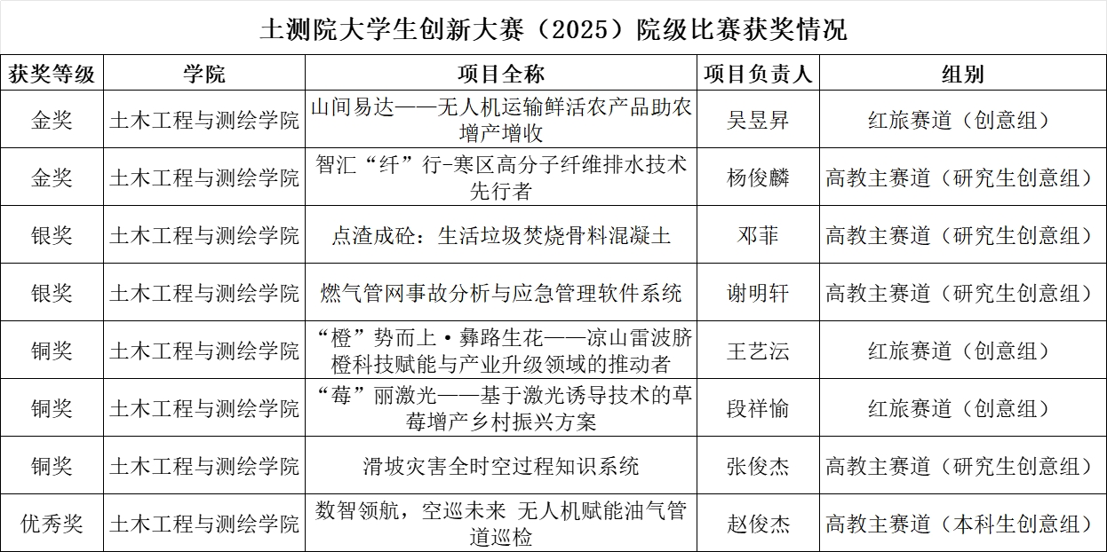 為全面落實“以競賽強本領、以實踐促教學、以創新育人才” 的育人導向,充分激發大學生創新思維,全面提升實踐應用能力。5月8日,2025中國國際大學生創新大賽土測院院賽圓滿落幕。共有8 組參賽團隊報名,涵蓋“高教主賽道”和“青年紅色筑夢之旅”賽道。根據本次比賽評審規則中“同分處理辦法”(如出現同分情況,經評審組商議可并列獲獎),經評審組復核確認,大賽共評選出金獎2項、銀獎2項、銅獎3項、優秀獎1項。