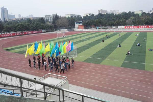 在彩旗隊的訓練中,四列隊員直舉飄揚的彩旗,邁著整齊的步子,伴隨著響亮的口號,在操場上一圈又一圈地排練著。到了主席臺正前方時,列隊突然散開,將整個操場圍住,隊員們揮動著手中飄動的彩旗,場面十分壯觀。