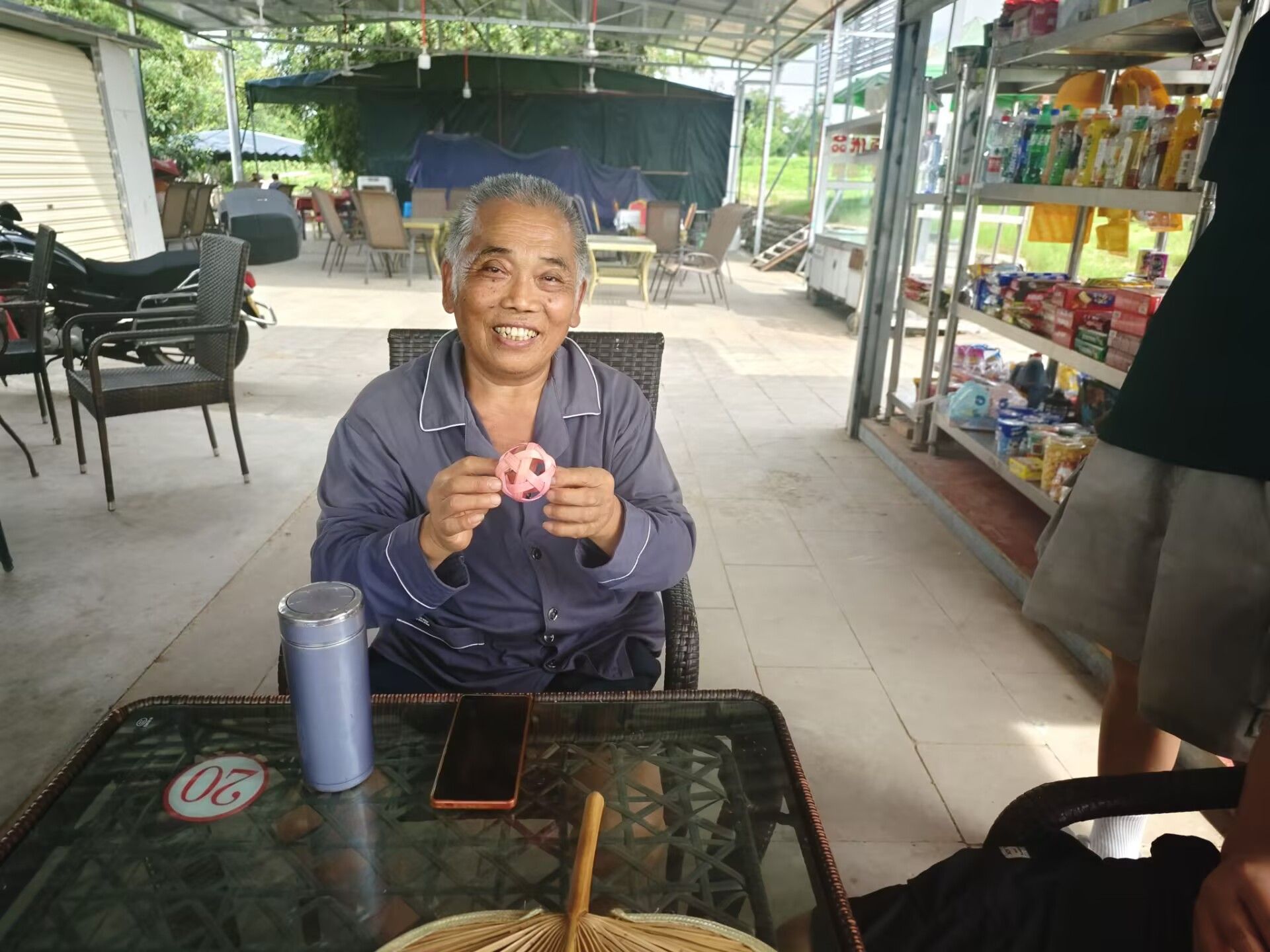 圖為老人對竹篾球滿意的笑容